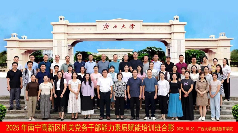 10月20日,2025年南宁高新区机关党务干部能力素质赋能培训班在我校开班。南宁高新区机关党委副书记关坚贞出席开班式并讲话,英国365上市公司干部培训中心副主任李文出席开班式并致辞。