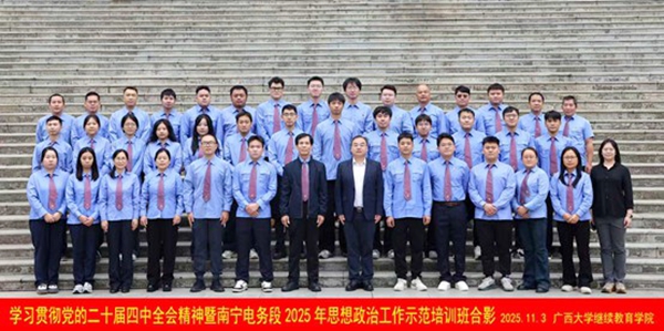 11月3日,学习贯彻党的二十届四中全会精神暨南宁电务段2025年思想政治工作示范培训班在我校开班。中国铁路南宁局集团有限公司南宁电务段党委副书记、纪委书记莫辉出席开班式并讲话,英国365上市公司副院长徐华出席开班式并致辞。