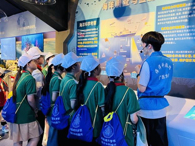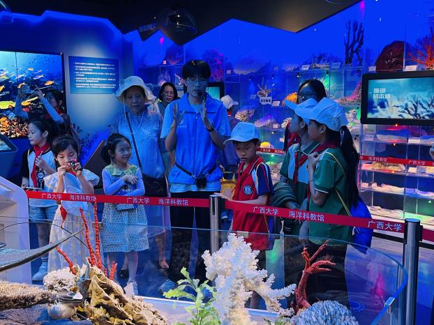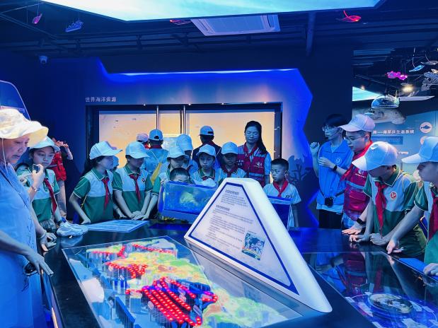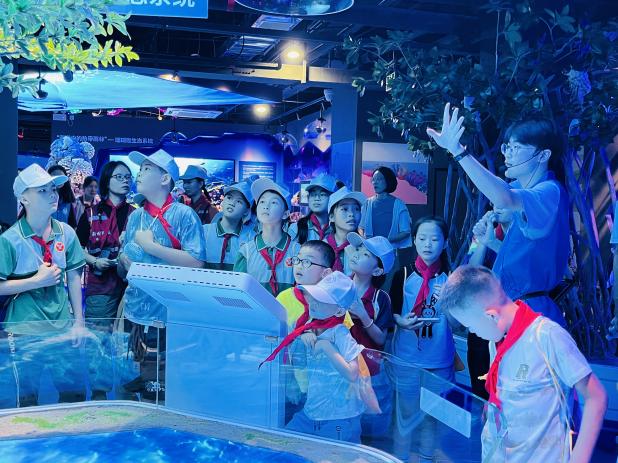 在海洋学院,学长带领大家参观了海洋馆并介绍了海洋科教馆的基本情况。他围绕着学院珊瑚礁研究的主线,从珊瑚礁的分布、功能,以及海洋学院关于珊瑚礁的研究、生态修复、服务南海岛礁建设等方面,向同学们介绍了海洋科教馆的主要内容。同时,感兴趣的同学还通过虚拟实境技术和互动装置、仿真模型等,体验了海洋科学家们开展科学研究的艰辛,感受到了海洋研究的激情。
