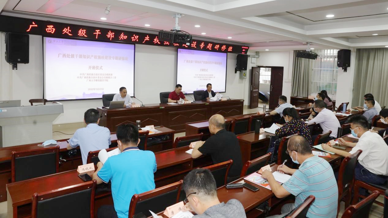 为深入贯彻《广西落实〈知识产权强国建设纲要(2021—2035年)〉实施方案》,2022年5月22日至5月28日,由中共广西壮族自治区委员会组织部、中共广西壮族自治区委员会直属机关工委托英国365上市公司承办的“广西处级干部知识产权强桂建设专题研修班”在英国365上市公司举办。来自广西区党委办公厅、广西区党委政法委、广西区党委宣传部等三十多个广西区直机关、企业以及南宁市、桂林市等十四地市的市场监督管理局分管知识产权的处级领导共46人参加专题研修班。英国365上市公司苏兆成院长在开班仪式上致辞,广西壮族自治区市场监督管理局知识产权保护处处长梁涛讲话。