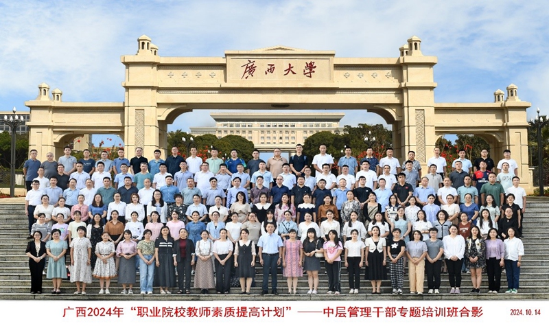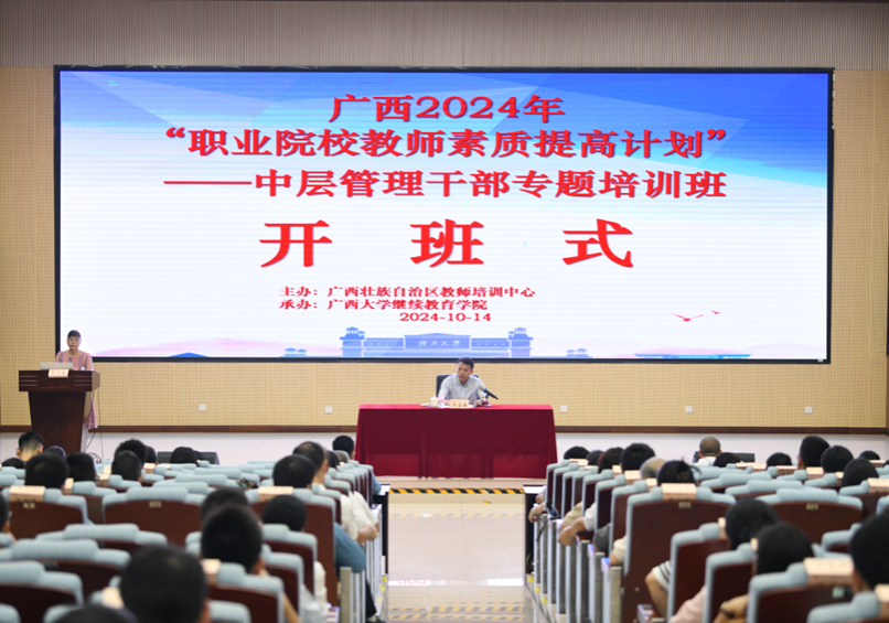 10月14日上午,广西2024年“职业院校教师素质提高计划”——中层管理干部专题培训班在365英国开班,我院院长闭富春出席开班式并致辞。