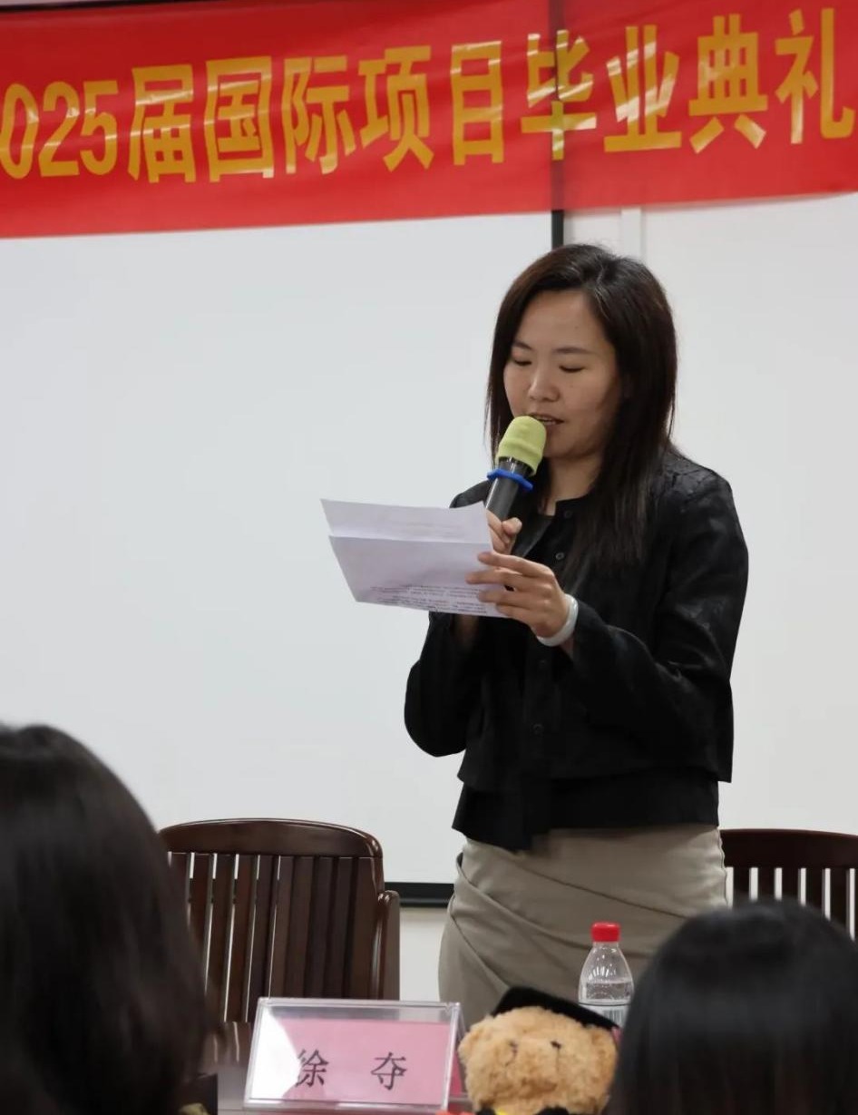 徐夺老师为同学送上祝福。她深情回顾与同学们共度的日子。身为学术导师,她常做同学们的“树洞”,倾听烦恼、助其振作。如今同学们将远赴异国,她鼓励大家正确面对文化冲击与学业压力,慢慢探索新环境。最后,她以改编的《Rick and Morty》台词提醒同学们张弛有度,保持梦想节奏。同学们即将从预科启程,奔赴广阔天地,徐夺老师希望大家照顾好自己,期待大家学有所成、闪耀重逢。